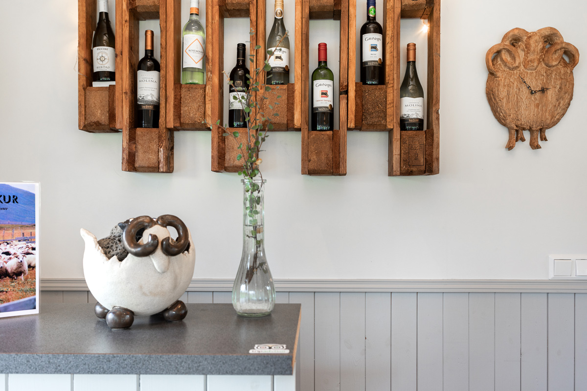 Lambakjötið á matseðlinum er af okkar eigin lömbum, silungurinn er veiddur í Nykurvatni og þorskur og ýsa eru keypt af smábátasjómönnum á Vopnafirði.